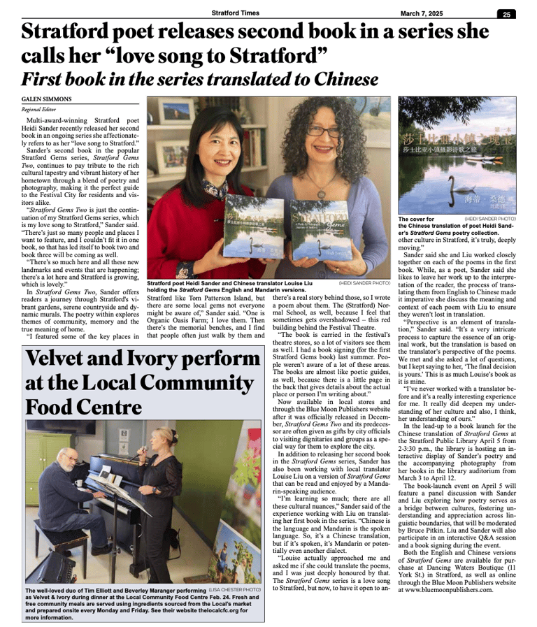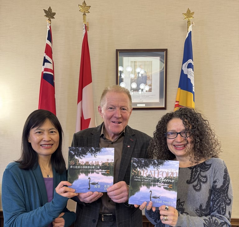 Stratford City Mayor Martin Ritsma proudly holds the newly released translation of Stratford Gems, joined by translator Louise Liu, and poet and photographer her Heidi Sander, who presents her original work. The gathering took place in the Council Chambers, celebrating cross-cultural creativity and literary collaboration—bringing inspiration and pride to our local community.